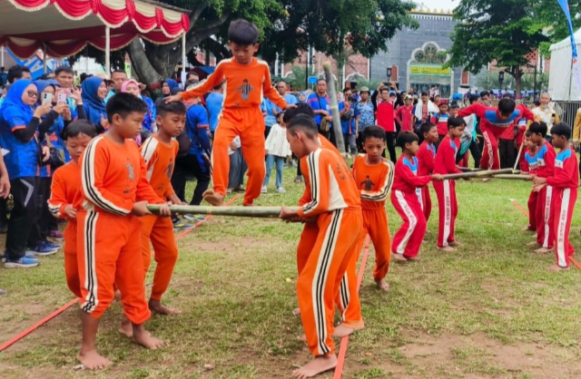 Dindikpora Brebes Kenalkan Umpak Bambu Sebagai Permainan Tradisional pada Anak di Hari Jadi ke-348